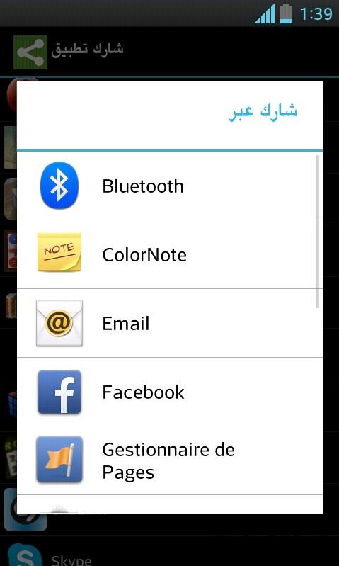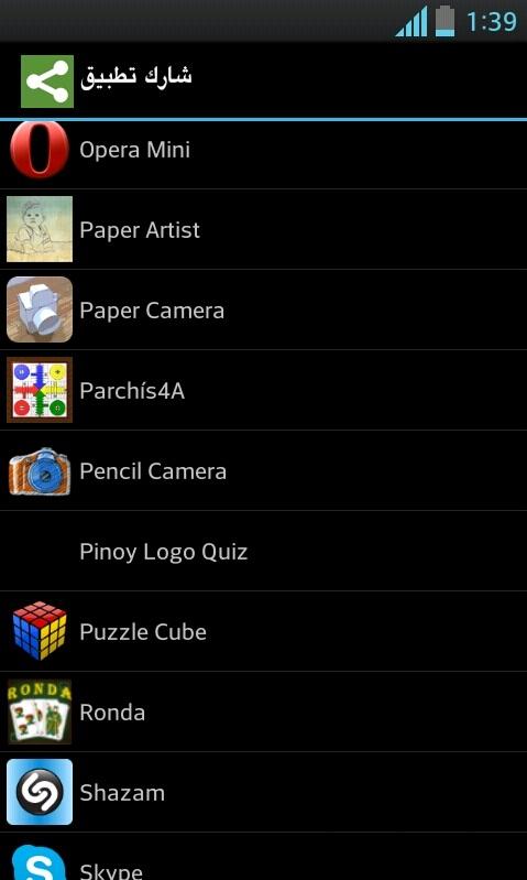 "شارك تطبيق" يمكنك من إرسال روابط تحميل هذه التطبيقات إلى معارفك وأصدقائك عبر bluetooth, e-mail أو برامج المحادثة الأخرى مثل Whatsapp، SMS ...