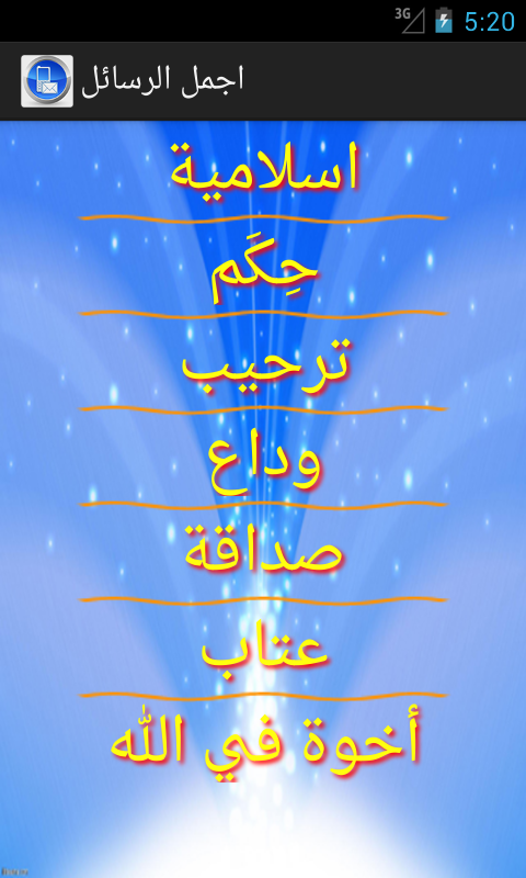 تطبيق جميل لإرسال الرسائل. يحتوي على كم كبير من الرسائل مصنفة حسب النوع و المناسبة: اسلامية , حِكَم , ترحيب , عتاب .... الخ.