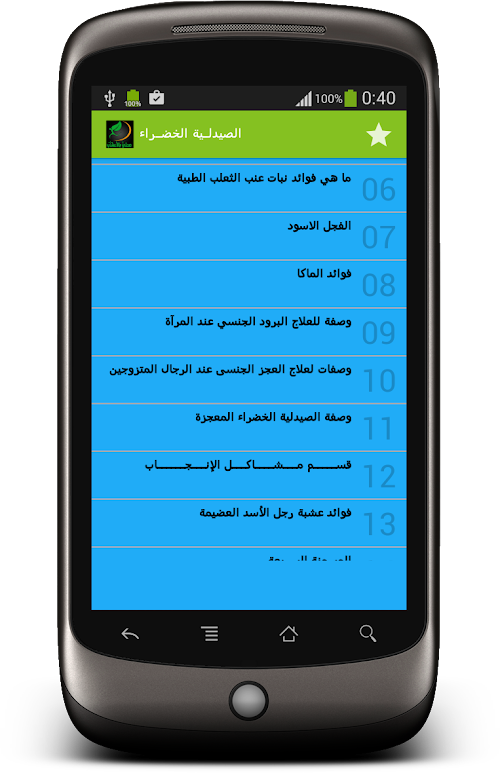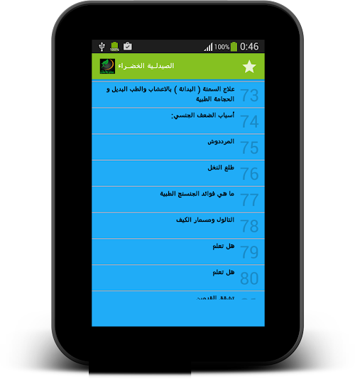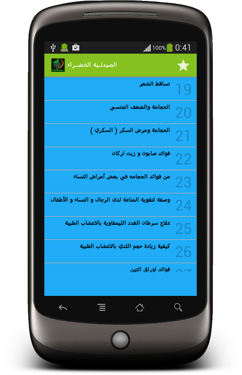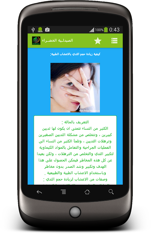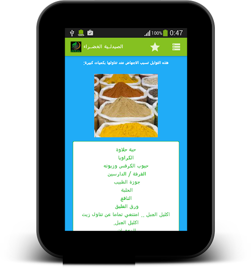 تطبيق يحمل لكم هده المرة ادوية طبيعية او ما يسمى بالطب البديل حيث نرى ان التداوي بالاعشاب اصبح من الضروريات في حياتنا اليومية فسوف تجدون في هدا التطبيق امراضا وعلاجها بالاعشاب الطبيعية كعلاج العقم وعلاج مرض النقرس....... وايضا ستجدون وصفات طبيعية للجمال والكثير من الحلول الطبيعية