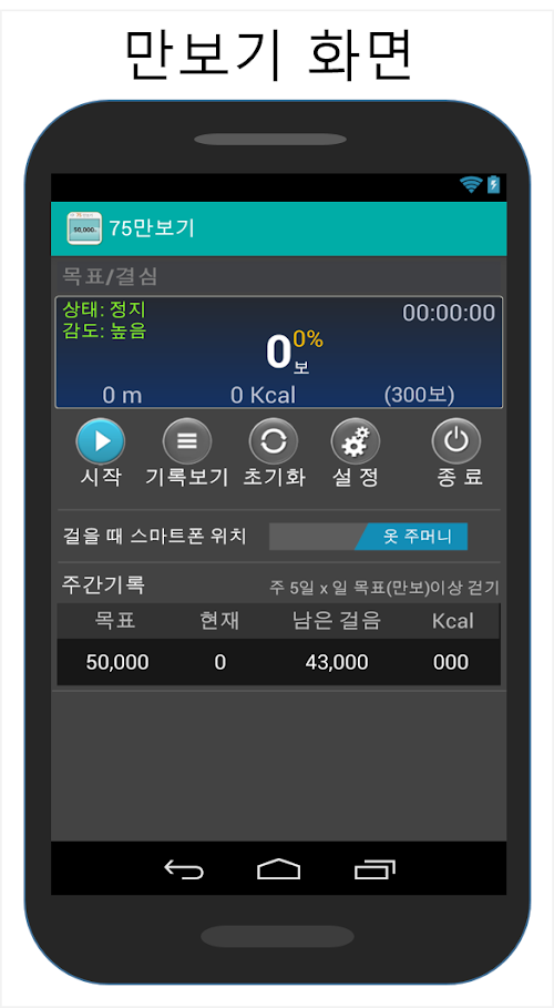 75 만보기 앱(75 : 7 = 1주일, 5=5일 이상)은 1주일 단위로 걷기 운동을 효과적으로 할 수 있도록 일일기록과 더불어 주간기록을 확인할 수 있도록 표시하여 주간단위 운동을 습관화할 수 있도록 도와드리는 만보기 앱 입니다