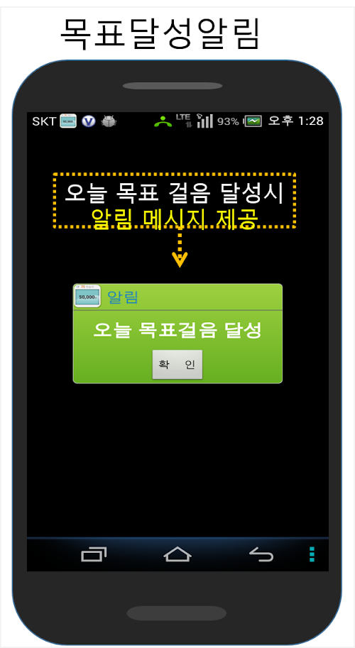 만보기 앱이 화면에 떠있지 않아도 백그라운에서 걷기기록은 계속 동작하며 걷기 기록을 확인하기 위해 매번 만보기 앱을 찾아 실행해야 하는 번거로움을 줄이기 위해 “금일 걸음수와 목표 달성율”을 화면 상단에 항상 나타나도록 팝업메시지 기능을 구현하였습니다