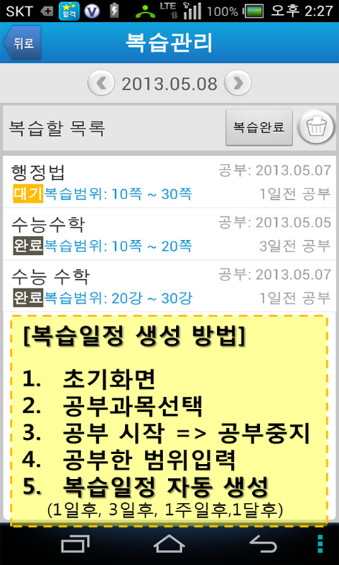 눌러주세요(대기에서 복습완료로 아이콘이 바뀝니다)