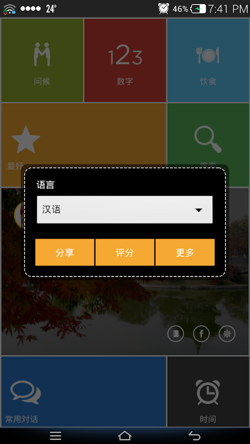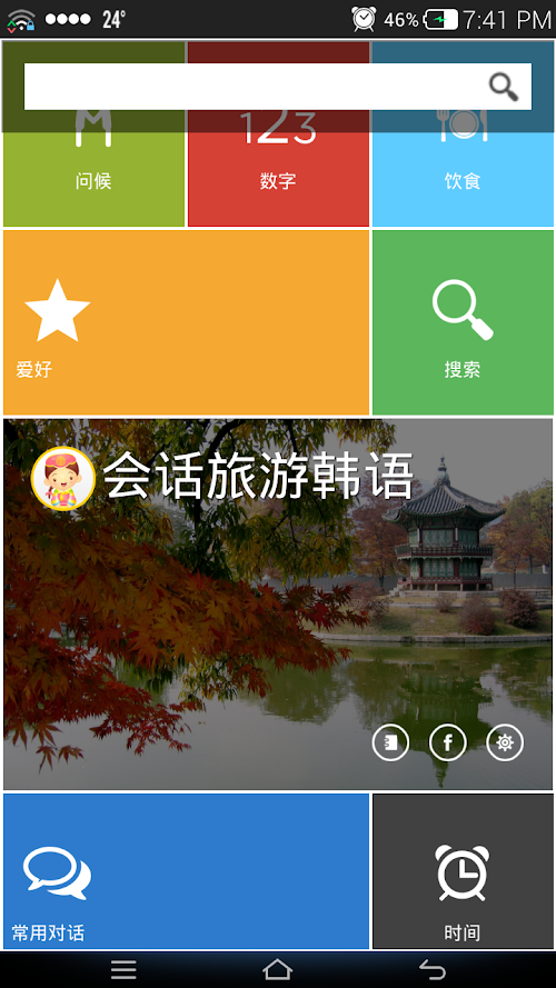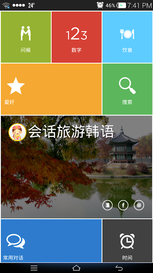 韩语会话应用具有2000多句话。这些基本句话向打算去韩国留学、旅游、工作服务。会话主题丰富,包括18个:问候、时间、数字、方向、地点、购物、约会、家庭……等主题。