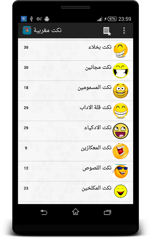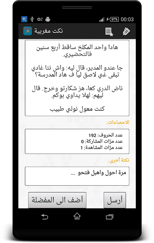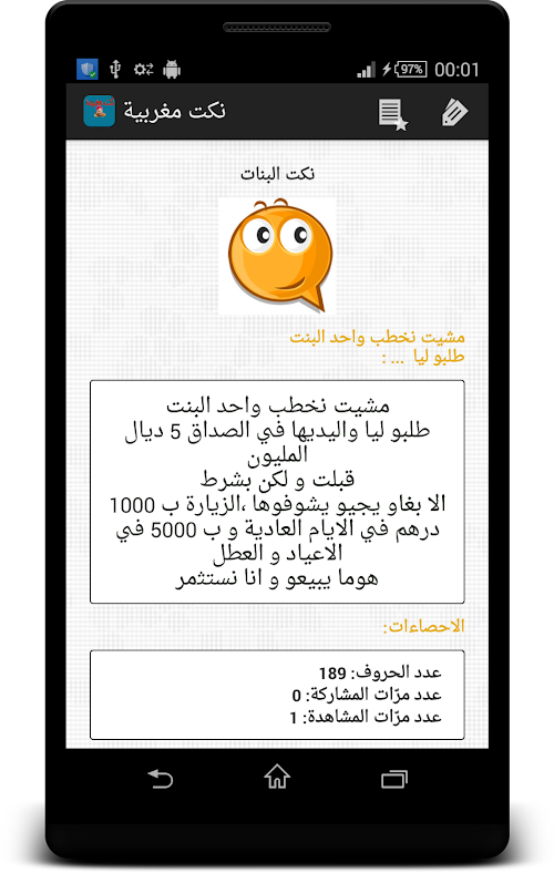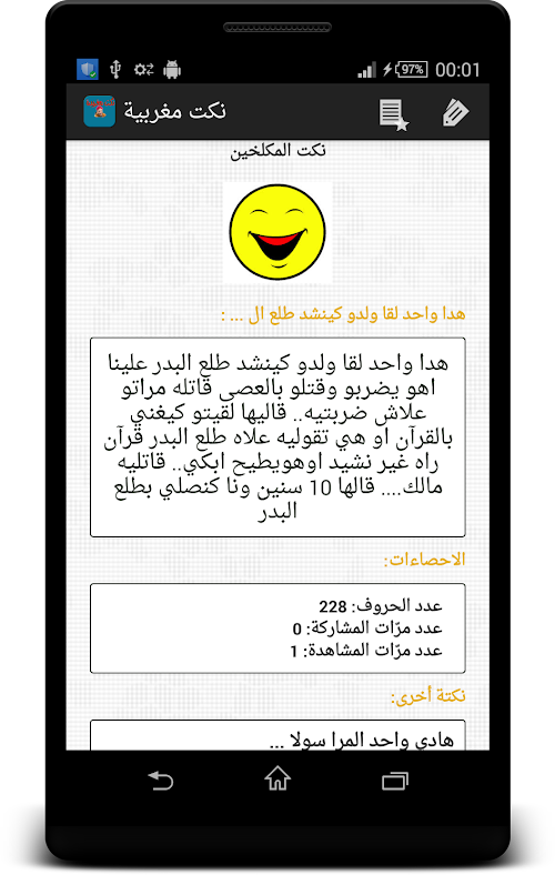 جميل نكت كبور و الشعبية تطبيق يزودكم باخر النكت المغربية و الهدف منه هو خلق نوع من الترفيه بين الاصدقاء و الاحباب اتمنى ان ينال اعجابكم و اوقات ممتعة مع نكت كبور و الشعيبية Jokes Kebbour beautiful and popular application provides you with the last Moroccan jokes and the goal is to create a kind of entertainment among friends and loved ones. I hope that you like it and obtain a good time with jokes and Shuaiba Kebbour