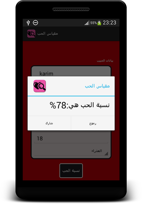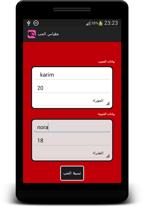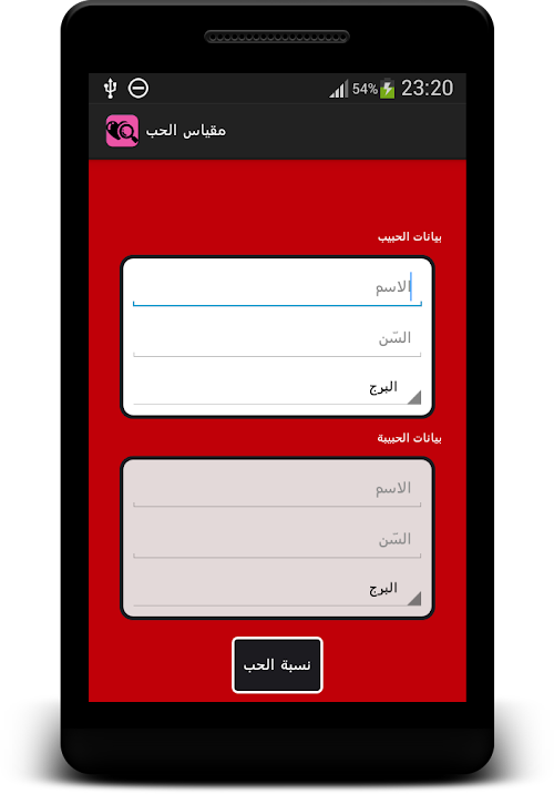 تطبيق مقياس الحب يعطيك فكرة عن نسبة تلاقي الافكار و الخواطر بين الحبيبين ودلك بادخال اسم بالاحرف اللاتنية وسن وبرج كل حبيب كما يمكنك مشاركة النتيجة مع حبيبك واصدقائك عبر وسائل التواصل الاجتماعي Love scale application gives you an idea of the proportion of the convergence of ideas and thoughts between the couple and knead enter a name initials Latin Lawson Tower every lover as you can share the result with your lover and your friends via social media