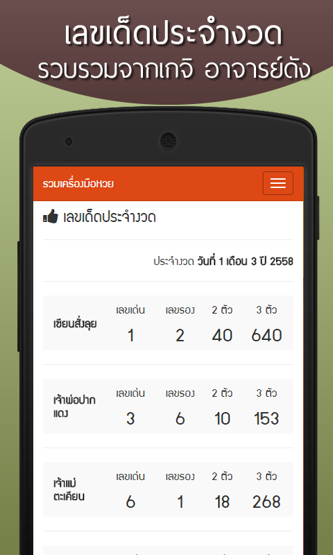 - เลขเด็ดรายงวด : รวมรวมจากเกจิอาจารย์ดังซึ่งคัดสรรมาแล้วว่าเชื่อถือได้