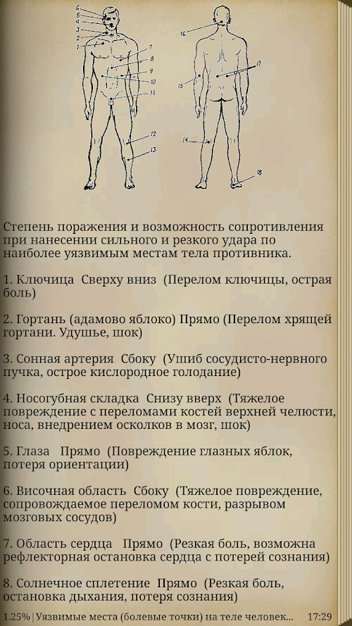 Дополнительную информацию по вопросам физического развития и тренировке навыков самообороны можно найти на сайте: http://www.physical-education.ruKnowledge of vulnerabilities on the human body contributes to more efficient physical impact on the subject in self-defense. Vulnerable spot is considered that part of the body, shock, pressure or twisting which causes injury, severe pain, upset human vital functions. Most often it places on the human body, where the main nerves and ganglia; large blood vessels; places where the bones are least protected muscles; joints; the internal organs.