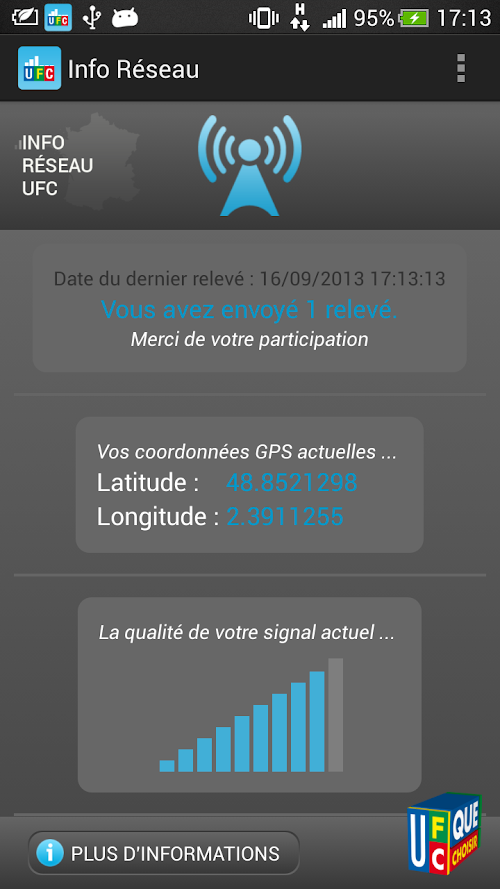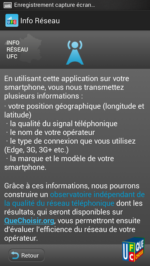 Merci de votre participation Network Info is a tool for test coverage of mobile networks developed by UFC Que Choisir.
