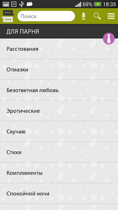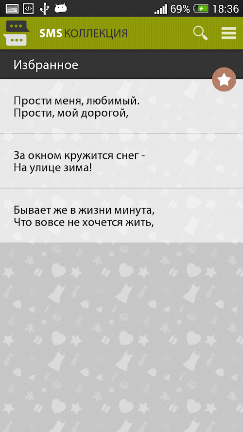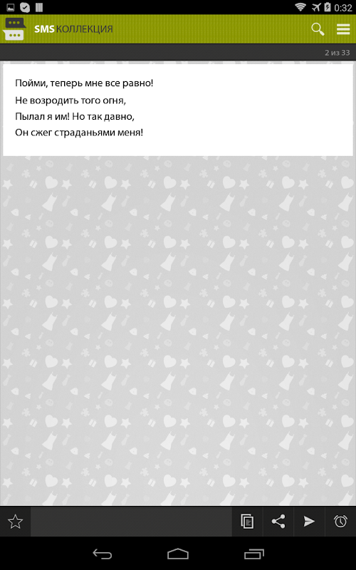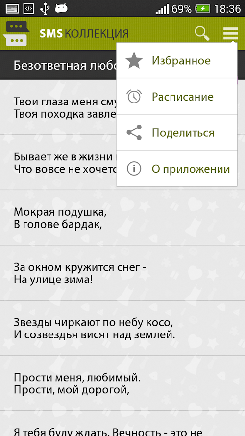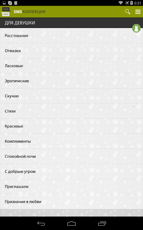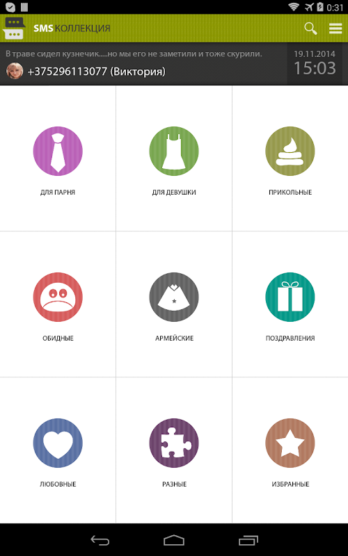 и многое другое.Huge SMS collection consisting of more than 7000 messages, with the ability to send scheduled, which are represented in 100 different categories!