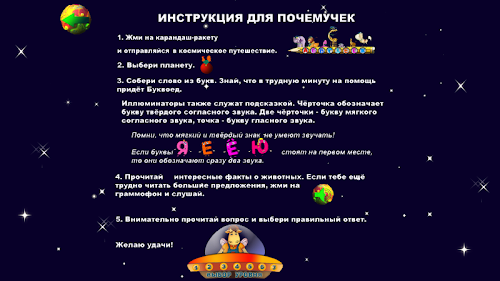 В окошках-иллюминаторах расположена звуковая схема слова. Яркие эффекты, контекстные подсказки превращают сложное упражнение в интересную игру. Буквы не стоят статично на месте, а вращаются по кругу. Это добавляет азарта при выполнении, так как надо не только знать правильный выбор, а еще и обладать моторными навыками, чтобы «поймать» букву. Свою роль здесь играет и мелкая моторика.