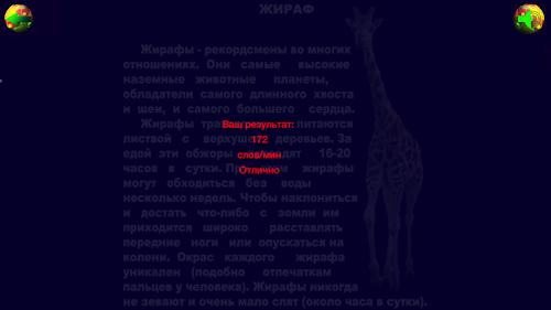 We were adapted texts for preschool and primary school children, therefore, we check the reading technique. In the next version of the program will be set a timer for determining the number of characters read per minute in automatic mode, this feature will be useful for parents who choose to homeschool.