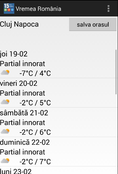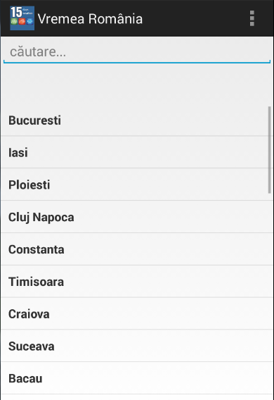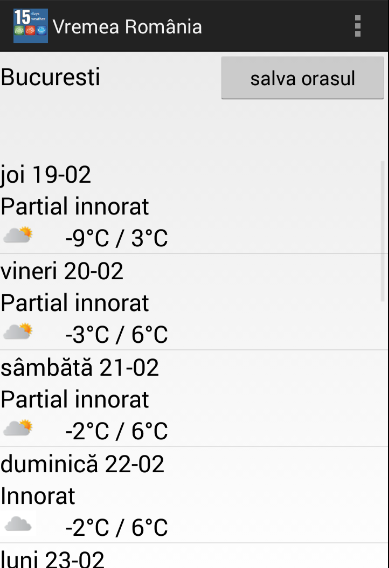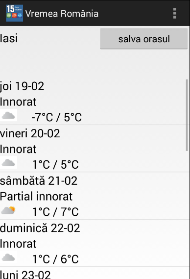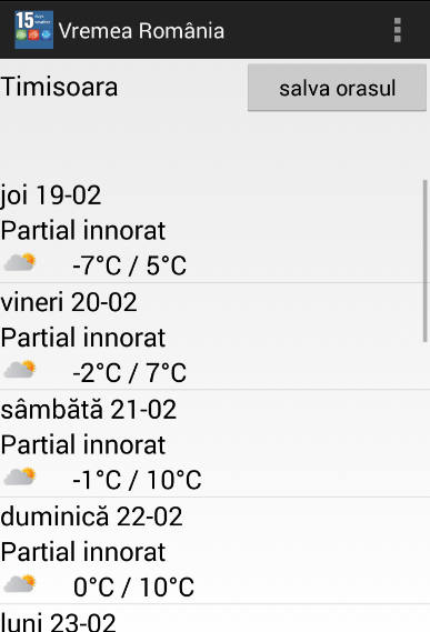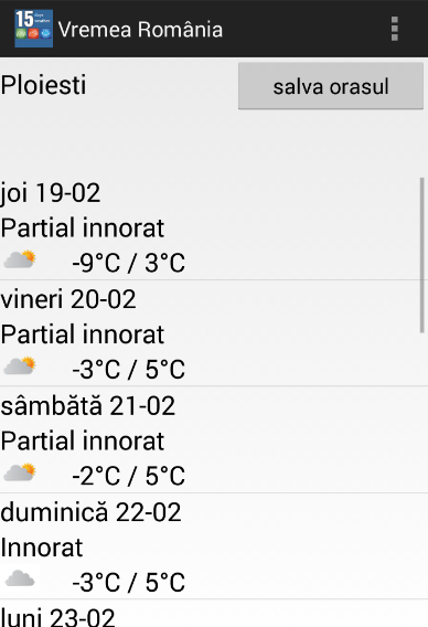 * App Vremea România dă Prognoza meteo 15 zile de orașe din România. Există toate statele și orașele sale.