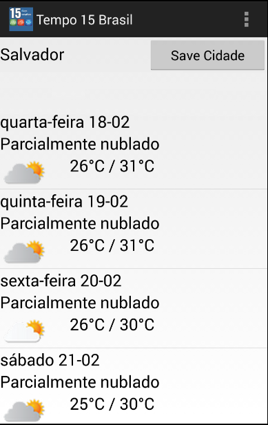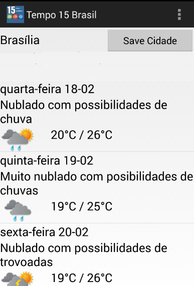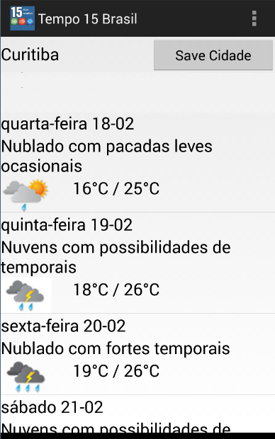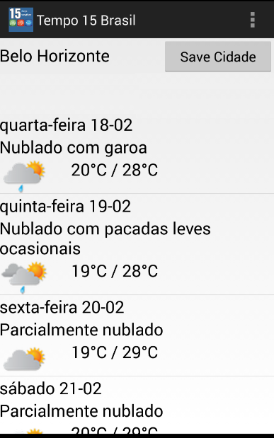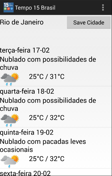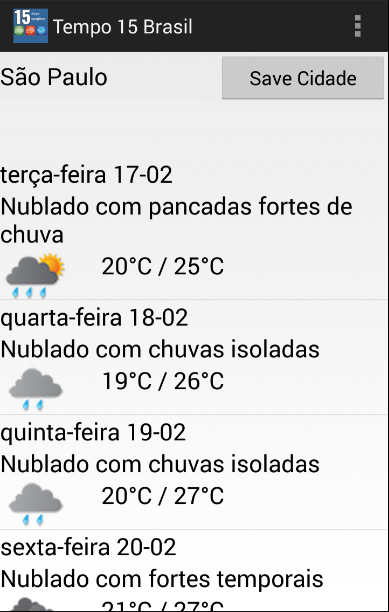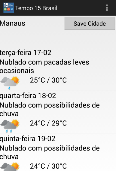 ** Você pode usar o "Save the City" botão de atalho de sua cidade. Quando você salvar a cidade que você deseja ver os seus 15 dias resulta de tempo, a aplicação mostrará automaticamente o tempo 15 dias para a cidade nos próximos usos.* Brazil Weather application gives 15 days weather forecast for cities in Brazil. There are all states and cities.