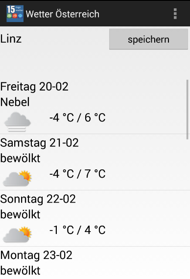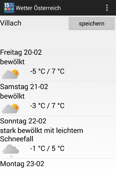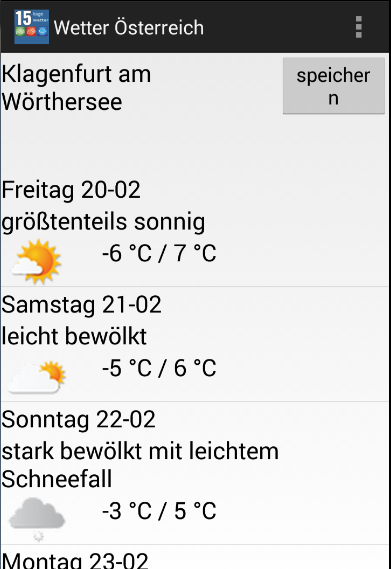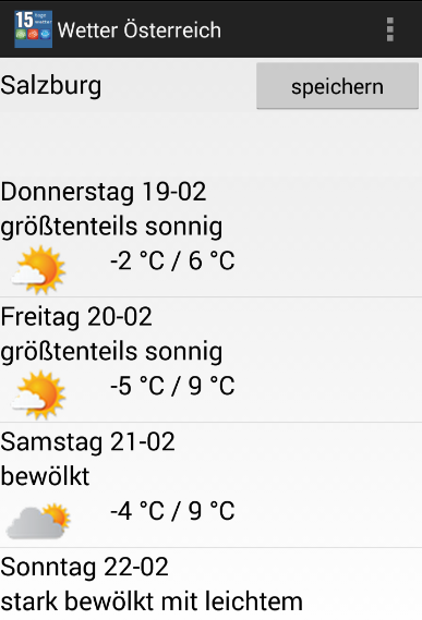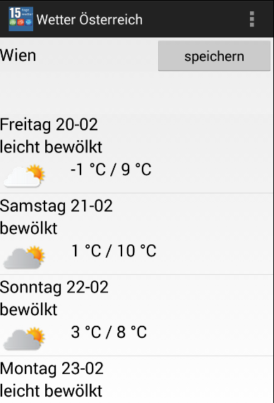 * Wettervorhersage Österreich App bietet 15 Tage Wettervorhersage für Städte in Österreich. Es gibt alle Staaten und seine Städte.