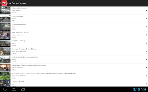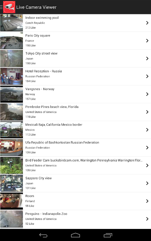 • Select cams by Country, HD, Category like cities, weather, traffic, restaurants, offices, zoos, airports, beaches, etc.