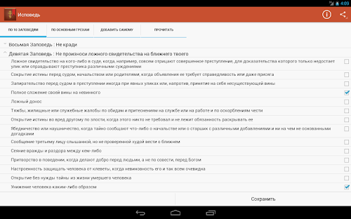 К сожалению, исходники этого приложения мною утеряны - изменить его уже не могу, но могу поменять аннотацию в магазине.Attention ! "Hints" to the content of the confession is very controversial and servants of the Church, and for me, the developer of this application, even if done in literature sold in the temples.