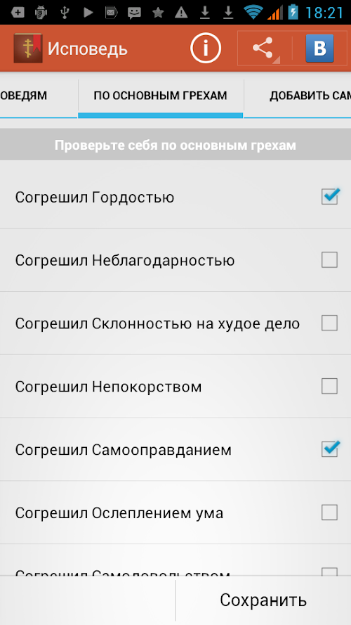 Внимание ! содержание "подсказок" для исповеди весьма спорное и для служителей Церкви, и для меня, разработчика этого приложения, хоть и сделано по литературе, продающейся в храмах .