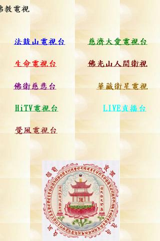 佛教網路電視台 : 佛光山人間衛視,法鼓山電視台,大愛電視台,生命電視台,佛衛慈悲台,LIVE直播台,華藏衛星電視,覺風電視台,HiTV電視台。