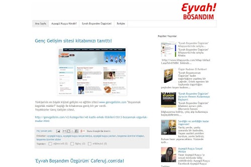Ayşegül Kuşçu'nun çok okunan "Eyvah Boşandım Özgürüm" kitabının bloğuna bu uygulama ile direkt bağlanabilir. Tüm yazıları ekleyebilir, yorum yapabilirsiniz.