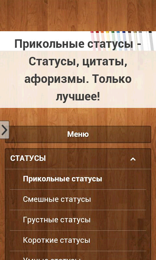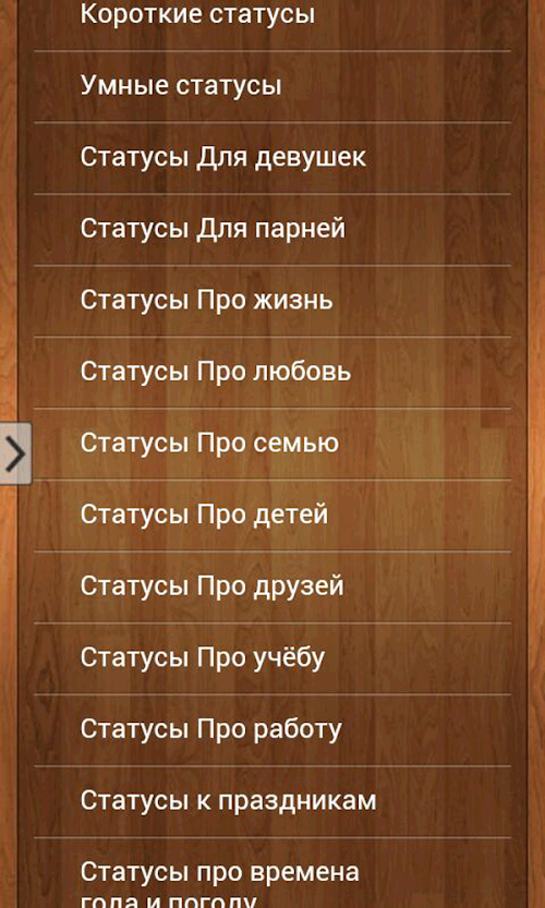 Надеемся, что наши труды принесут вам пользу, и вы всегда будете находить понравившийся статус под любое ваше настроение!Our application "New beautiful status in 2015" provides you with a large collection of beautiful statuses that are always at hand, and you can share with your friends at any moment his thoughts, moods, feelings through their status!