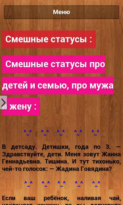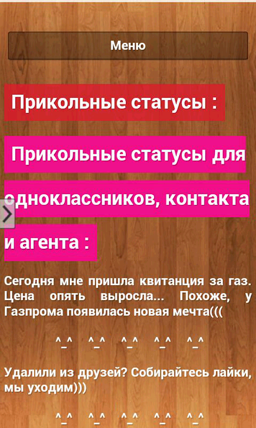 The annex contains status on various subjects, such as funny statuses, funny, funny statuses, krustnye status .. Also our statuses are divided into categories such as the status for girls and for boys, for adults and children, about the study, and about work, about druzhdu and love, about family and friends and so on ... You can always easily find the desired status instantly!
