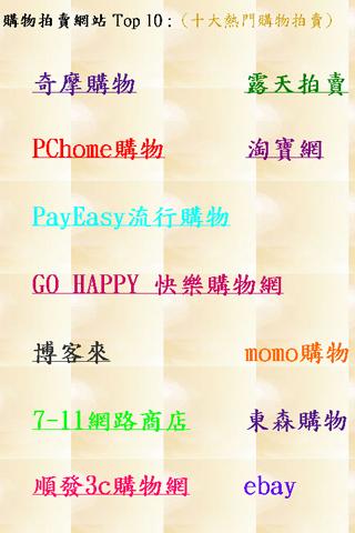 奇摩購物,露天拍賣,PChome購物,淘寶網,PayEasy流行購物,GO HAPPY 快樂購物網,博客來,momo購物,7-11網路商店,東森購物,順發3c購物網,ebay。