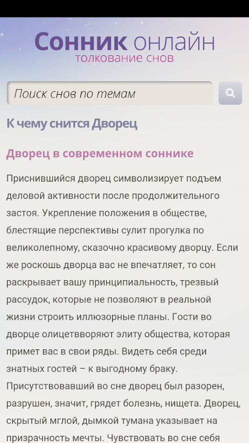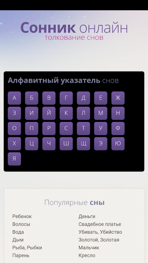 Это приложение поможет правильно понять сон, чтобы объяснить многие вещи и ситуации, происходящие в нашей жизни, одним глазком заглянуть в будущее, подсмотреть на суть проблем, и правильно решить их без тени сомнения.This application will help to understand a dream to explain a lot of things and situations that occur in our lives, one eye to look into the future, to spy on the nature of the problems and solve them properly without a shadow of a doubt.
