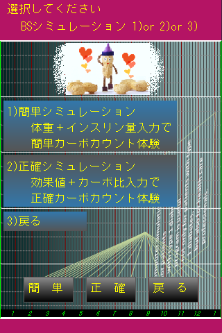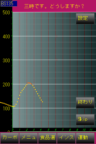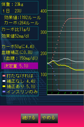 体重やインスリン量から簡易的に算出した値を基に血糖シミュレーションを行っており、実際の血糖の動きを示すものではありません。あくまでも参考値としてご覧ください[For people with type 1 diabetes, is a learning software of carbon count and insulin regulation]