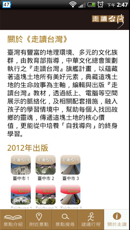 臺灣有豐富的地理環境、多元的文化族群,由教育部指導,中華文化總會策劃執行之『走讀台灣』旗艦計畫,以蘊藏著這塊土地所有美好元素,典藏這塊土地的生命故事為主軸,編輯與出版『走讀台灣』教材,透過此次發行的手機版本app,讓更多民眾和背包客,導覽台灣,走讀台灣各地文化。