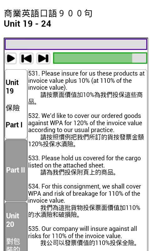 精選使用率最高、最具代表性的900句商用口語,範圍涵蓋產品介紹、詢價、報價、議價、訂貨、付運、保險、索賠等應用語,為有基礎英語水平的從業員,提供在線練習的平台,迅速提升口語應對能力,以最短的時間,由戰戰兢兢的菜鳥化身為輕鬆的老鳥,在職場上迎難而上,步步高陞。
