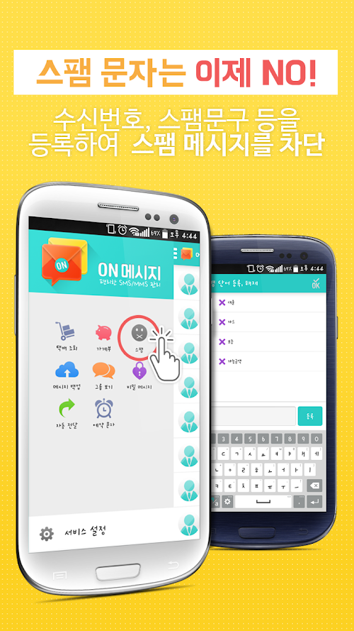- 수신번호, 스팸문구 등을 등록하여 스팸 메시지를 차단합니다.