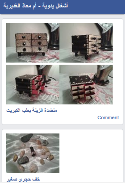 هنا تجدون معرضا لأعمال منوعة ومختلفة من الأشغال اليدوية والأعمال الفنّية للأخت أم معاذ الغديرية، صفحة الفيسبوك معمولة على شكل تطبيق لاجهزة الأندرويد، أرجو أن تنال هذه الأعمال إعجاب المشاهدين،