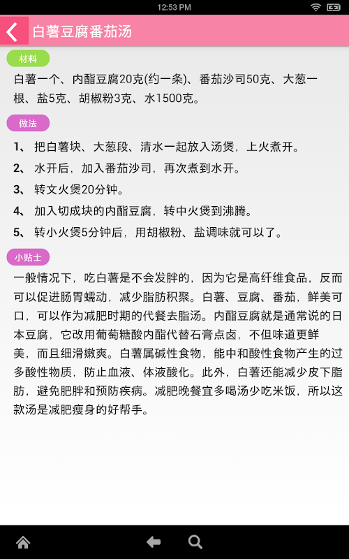 对自己的身形、体重不满意,想要减肥? 到美容院治标不治本,又得花不少钱,倒不如改善自己的饮食习惯。一来节省金钱,二来吃得健康,持之以恒便可以解决肥胖问题,再次美丽示人。本电子应用程式提供五十多款短期、长期的饮食餐单,切合不同需要的您。想减肥成功,请立即下载减肥食谱电子应用程式!