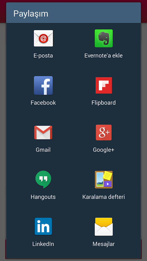Bu düğmelerden soldakine (PAYLAŞIM düğmesi) tıklayarak SMS ve Mail ile paylaşabilirsiniz ama tabi ki, Linkedin, Twitter, Skype gibi sosyal ağlarda da paylaşabilirsiniz. Seçimi size bırakıyoruz.