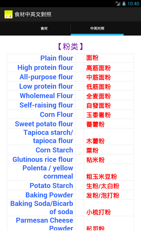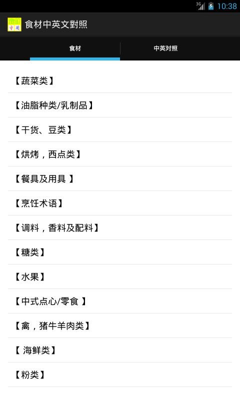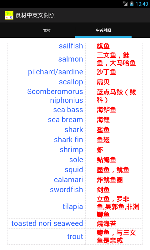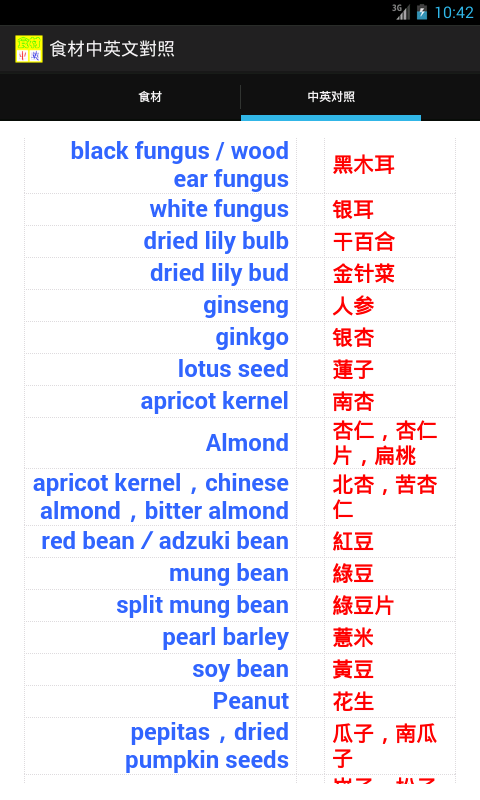 本应用以中英文对照的方式记录了大量食材名字。食材分成不同类别呈现。