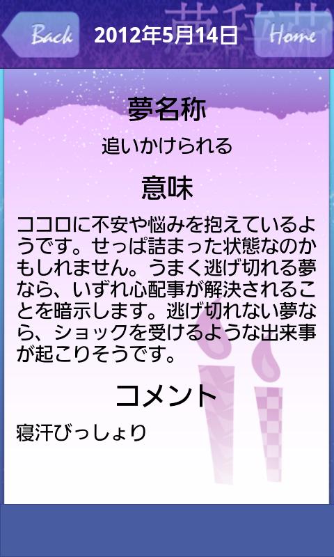・あなたの見た夢から、自身がどのような精神・心理状態かを診断し、アドバイスします。検索機能もあり簡単に夢の意図が判明!