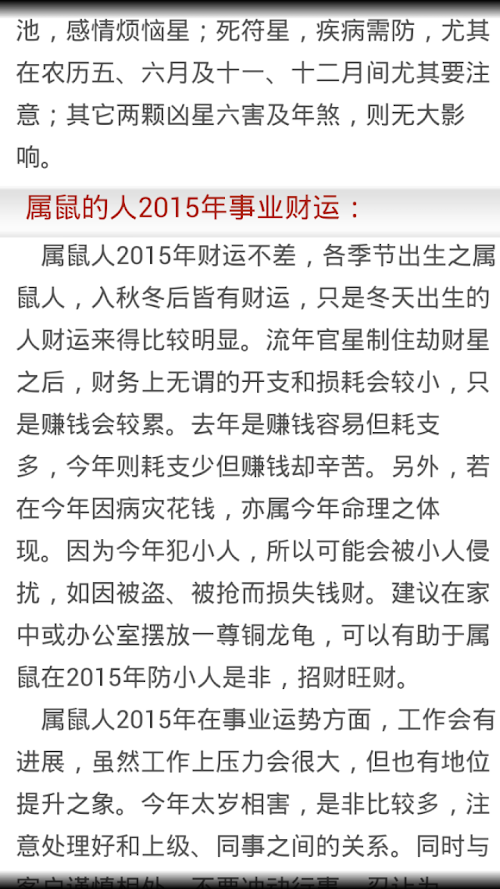 2015年运势预测,根据中国传统文化进行2015年的运势预测,包括:总体运势、爱情婚姻、事业财运、身体健康、灾祸化解等。