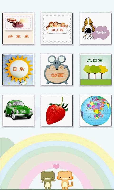 此版本包括:.日常知识、自然现象、幼儿园、.动物、.水果、车船、好东东、世界名胜、动画片。"Literacy Fun Card" starting from early childhood interest, through humor cute pictures and your baby learn language characters and a lot of common sense unconsciously. Click on the text to be applied, can be sound, many voices are recorded a year-old baby, kids sounds very cordial.