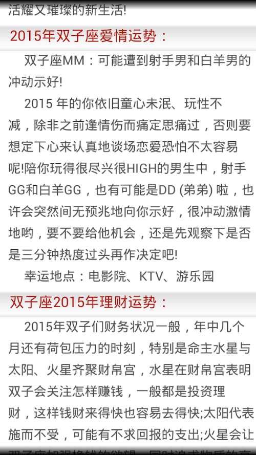 2015年星座运势预测,针对每个星座提供全面的运势预测,包括整体运势、爱情运势、经济运势、学业运势、事业运势、健康运势。