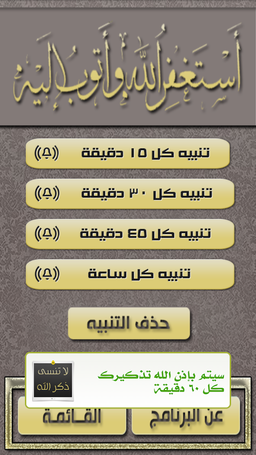هذا التطبيق عباره عن منبه لبعض الاذكار يتم اختيار وقت تنبيك وبذلك سوف يقوم التطبيق بالتذكير الصوتي له