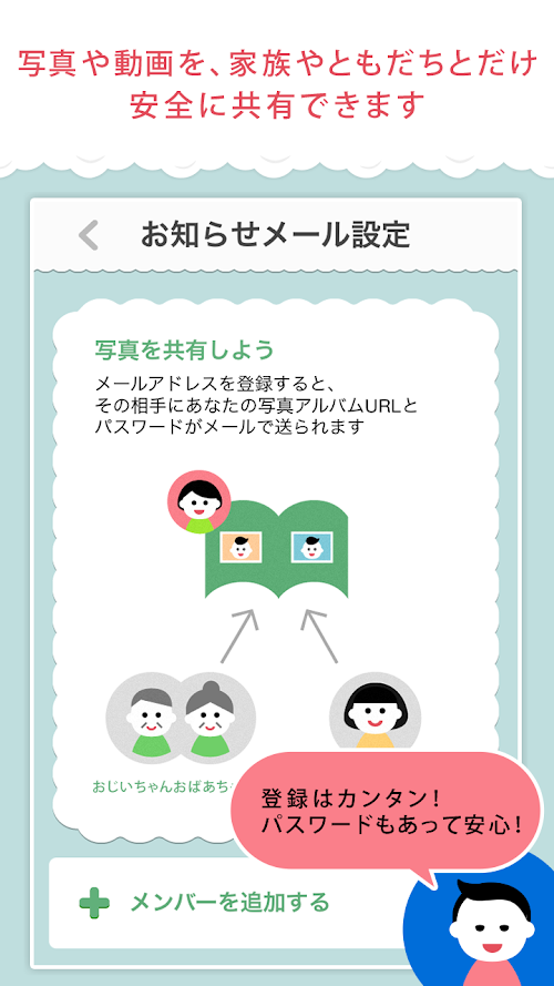 共有したい相手のメールアドレスを登録することで、アップロードした写真・動画・コメントを簡単に共有することができます。