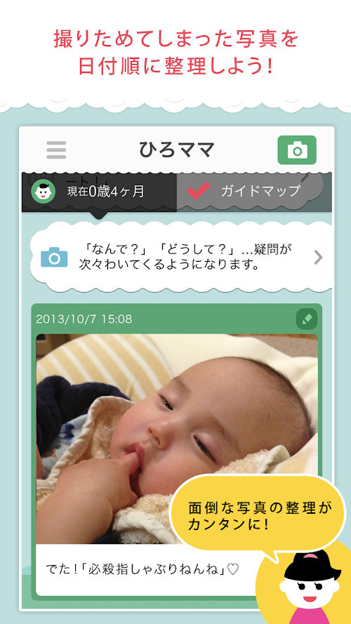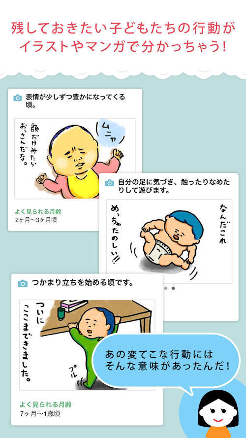 お風呂が気持ちよすぎてする「ほぇー」の表情、自分の手を不思議そうに見つめる「ハンドリガード」、トウモコロシ、スパゲッチュー等かわいい言い間違えなどなど、かわいいエピソードがつきないお子さんの「シャッターチャンス」を、月齢・年齢に合わせてタイムライン上の雲でお知らせします。先輩ママさんたちの生の声をもとにしているから、「あ、あの時撮っておけばよかった・・・」がなくなります!