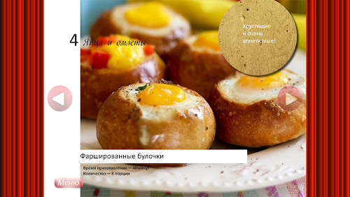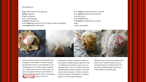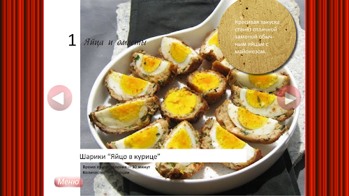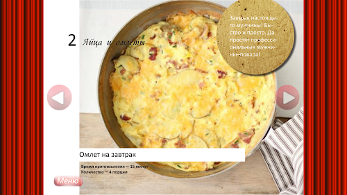 Приятного аппетита!In this book you will find about 31 pages of recipes with eggs and omelets.