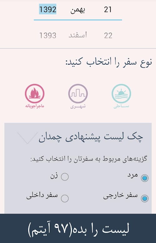 The "suitcase" Ability to build and manage the "checklist" of a trip there. You can build your own checklist, or a checklist according to the specifications, type of travel and Hmrahantan recommend you use them for personalization and reminder for each item that you want (Alarm) setting.