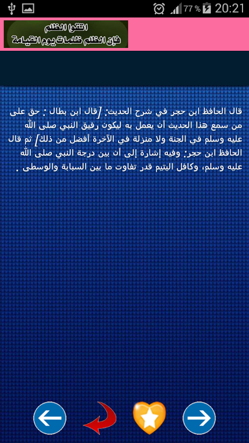 لتفعيل خاصية التنبيه التلقائي اليومي: من فضلك ادخل على "حديث اليوم" ليتم تفعيل خاصية التنبيه يشتغل بدون انترنت ..لا تنسوا إخواني تقييم التطبيق و نشره بين أصدقائكم ... كما قال رسول الله صل الله عليه وسلم.. إن الدال على الخير كفاعله، و جعلها الله في ميزان حسناتك ate the description into English using Google Translate?