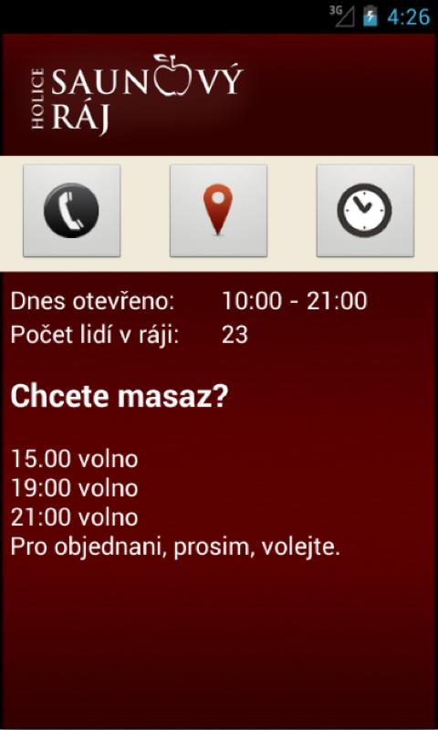 Časem snad přibudou možnosti jako rezervace masáží atp. A useful application for all lovers in the Sauna sauna paradise in Holice, which can easily find out how many people currently in the sauna, as is now open and if they are loose or masseuses.