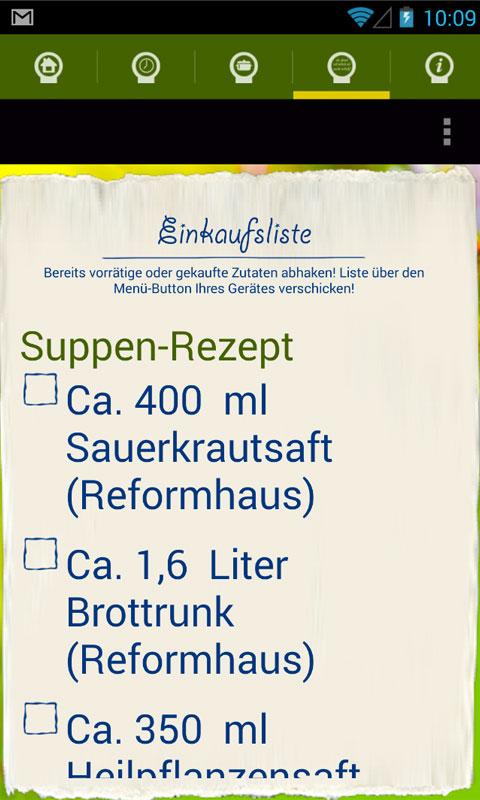 Unsere App informiert Sie und bereitet Sie auf Ihre 7-Tage-Kur vor. Das Programm erstellt für Sie die Einkaufsliste mit den Lebensmitteln und Getränken, die Sie für das Heilfasten benötigen, und begleitet Sie dann Tag für Tag und Schritt für Schritt durch die Schlank-Woche.