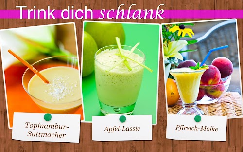 Die erfolgreiche Platz-1-App jetzt auch für Ihr Smartphone: Sie wollen ein paar Pfund abnehmen, ohne eine komplizierte Diät machen zu müssen? Dann nehmen Sie's leicht! Mit selbst gemachten Schlank-Drinks. Die sind schnell zubereitet, sehr gesund, richtig lecker und lassen die Pfunde purzelln. Denn mit natürlichen Fatburnern lassen sie Extra-Kilos keine Chance. Alles, was Sie dafür tun müssen: Genießen! Lassen Sie sich unsere 33 fruchtigen Abnehm-Drinks schmecken. Wir versprechen Ihnen: Sie begeistert sein - und schlank!