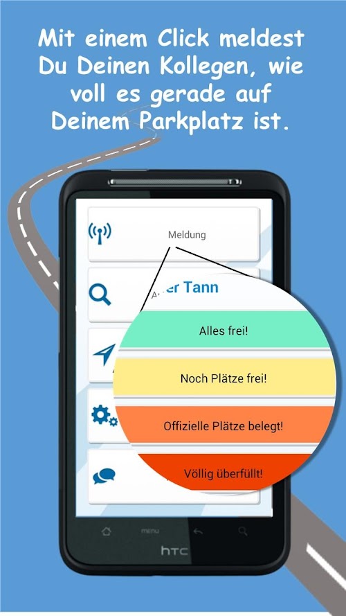 - Informier Deine Kollegen über die aktuelle Parksituation. Starte den Autobahnmodus und Du kannst jeweils beim Erreichen eines Parkplatzes mit einem einzigen Klick melden, wie voll es dort gerade ist. Deine Kollegen werden es Dir danken.
