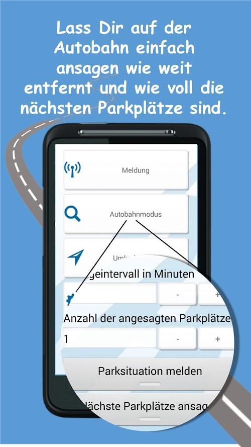 - Starte den Autobahnmodus und lass Dir regelmäßig die nächsten erreichbaren Parkplätze und deren aktuelle Belegung ansagen.